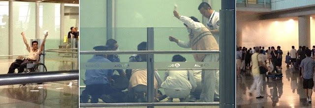 said the man detonated a home-made bomb at about 6.24pm local time. He was seen waving a packet above his head (see picture above left), then smoke filled the arrivals hall while shocked